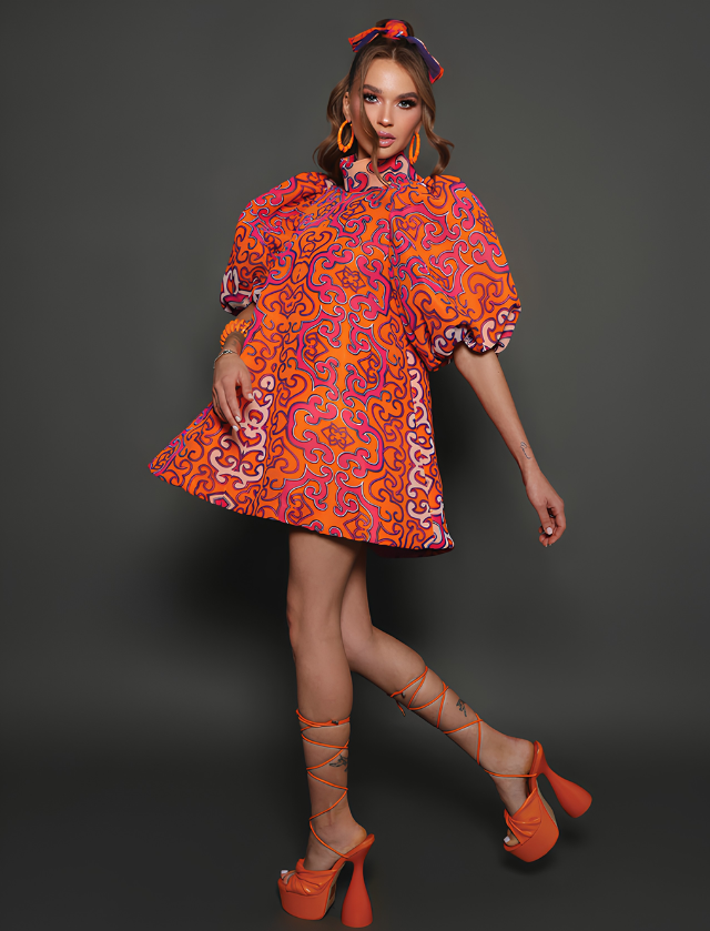 From the psychedelic mandarin-and-fuchsia prints to the pop glamour of hot pink paired with neon orange gloves, each look is a visual statement celebrating exuberance and elevated sophistication.