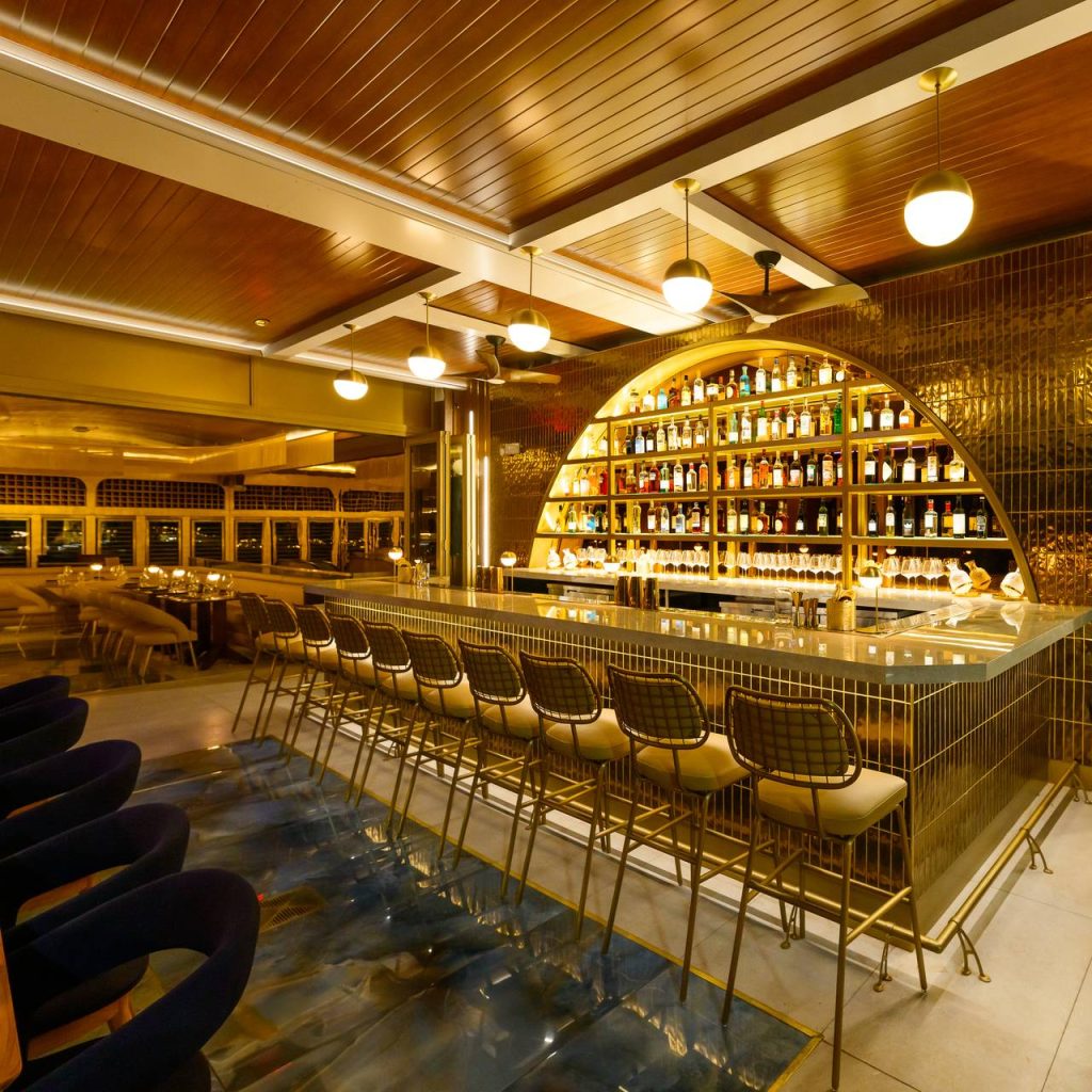 From the moment guests arrive beneath sculptural gold arches and a celestial-inspired ceiling, the narrative begins. A glowing escalator ascends into a 7,431-square-foot indoor and outdoor dining sanctuary framed by 24-karat gold-plated accents.
